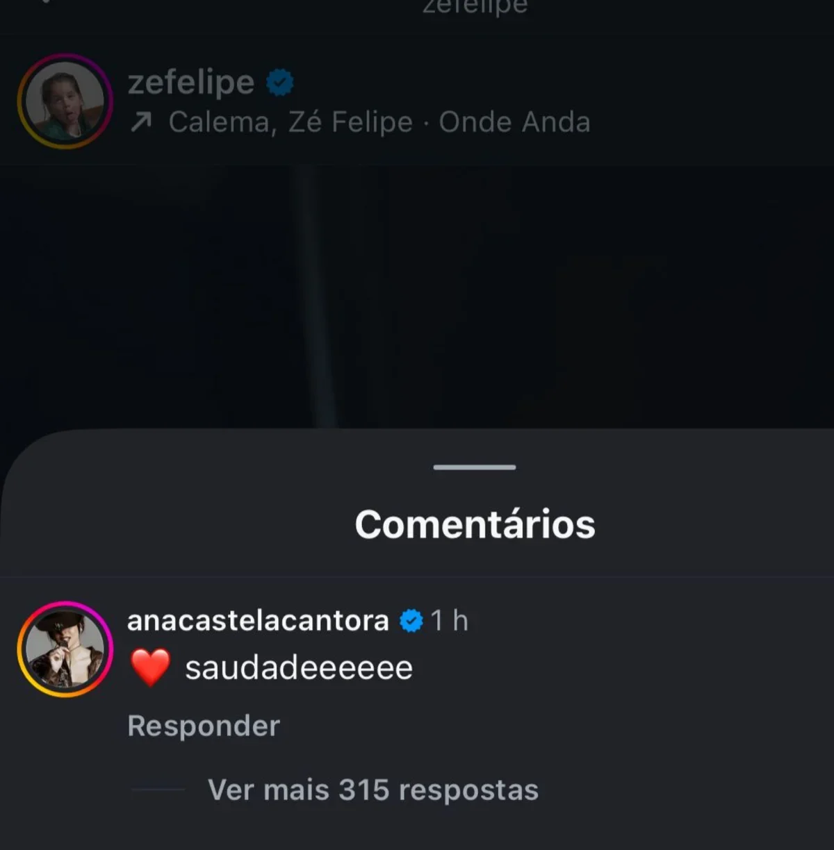 Zé Felipe também demonstrou reciprocidade ao publicar um print de uma chamada de vídeo com Ana Castela, junto da mensagem: “Amo você”.