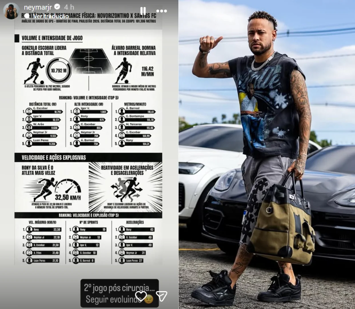 Ao publicar os documentos nos stories, o jogador enfatizou que ainda está em processo de retomada de ritmo, visto que completou apenas sua segunda partida oficial desde a intervenção cirúrgica. “Segundo jogo pós-cirurgia. Seguir evoluindo”, escreveu ele na legenda da postagem.