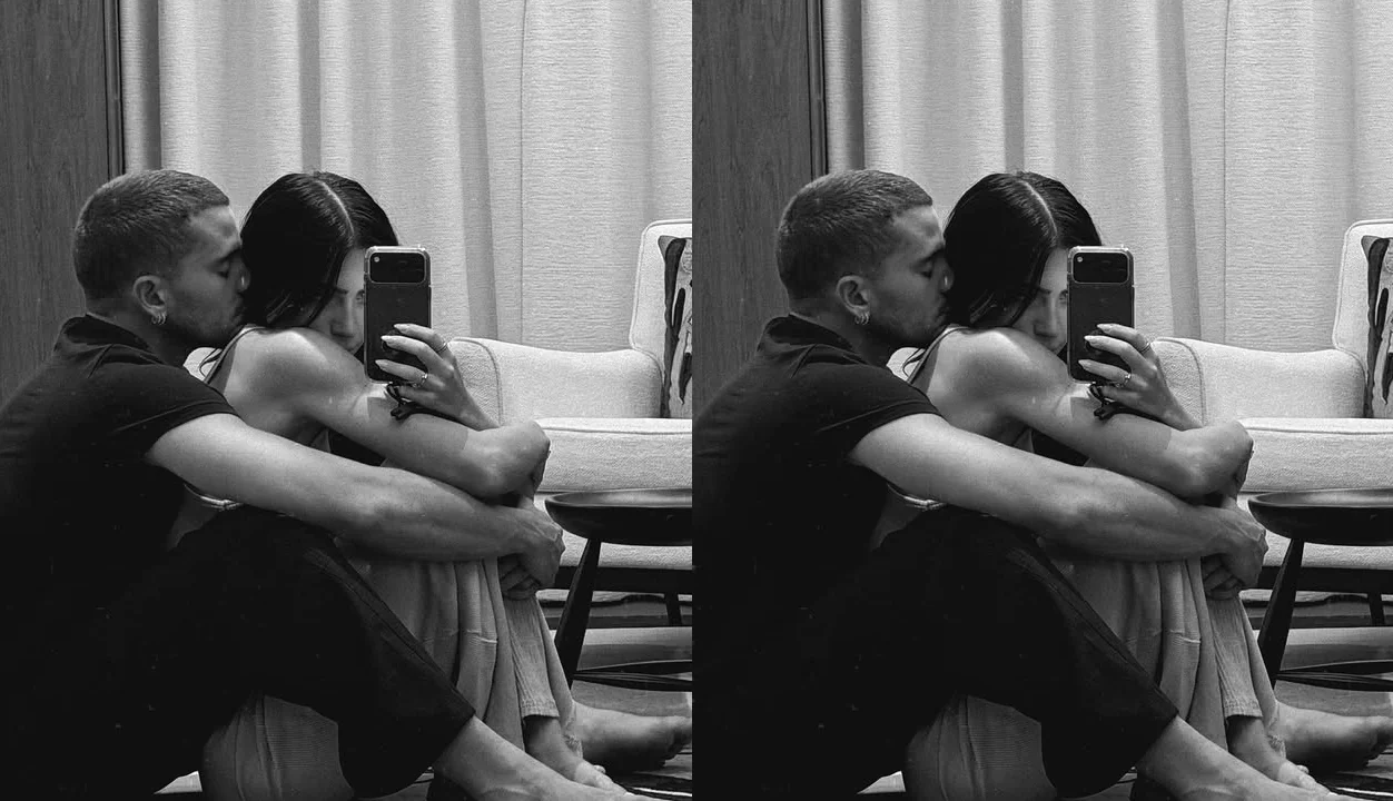 Na imagem em preto e branco, o casal aparece descalço e próximo, com Jade sentada entre as pernas do ator. André ainda surge dando um cheiro no cangote da influenciadora.