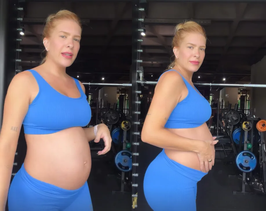 Surpresa com o tamanho da barriga, Lore mostrou o momento em vídeo. “Bom dia. Teve alguém que cresceu. Oito meses de nenekinho. Deu um pulo. Olha essa barriga”, disse.
