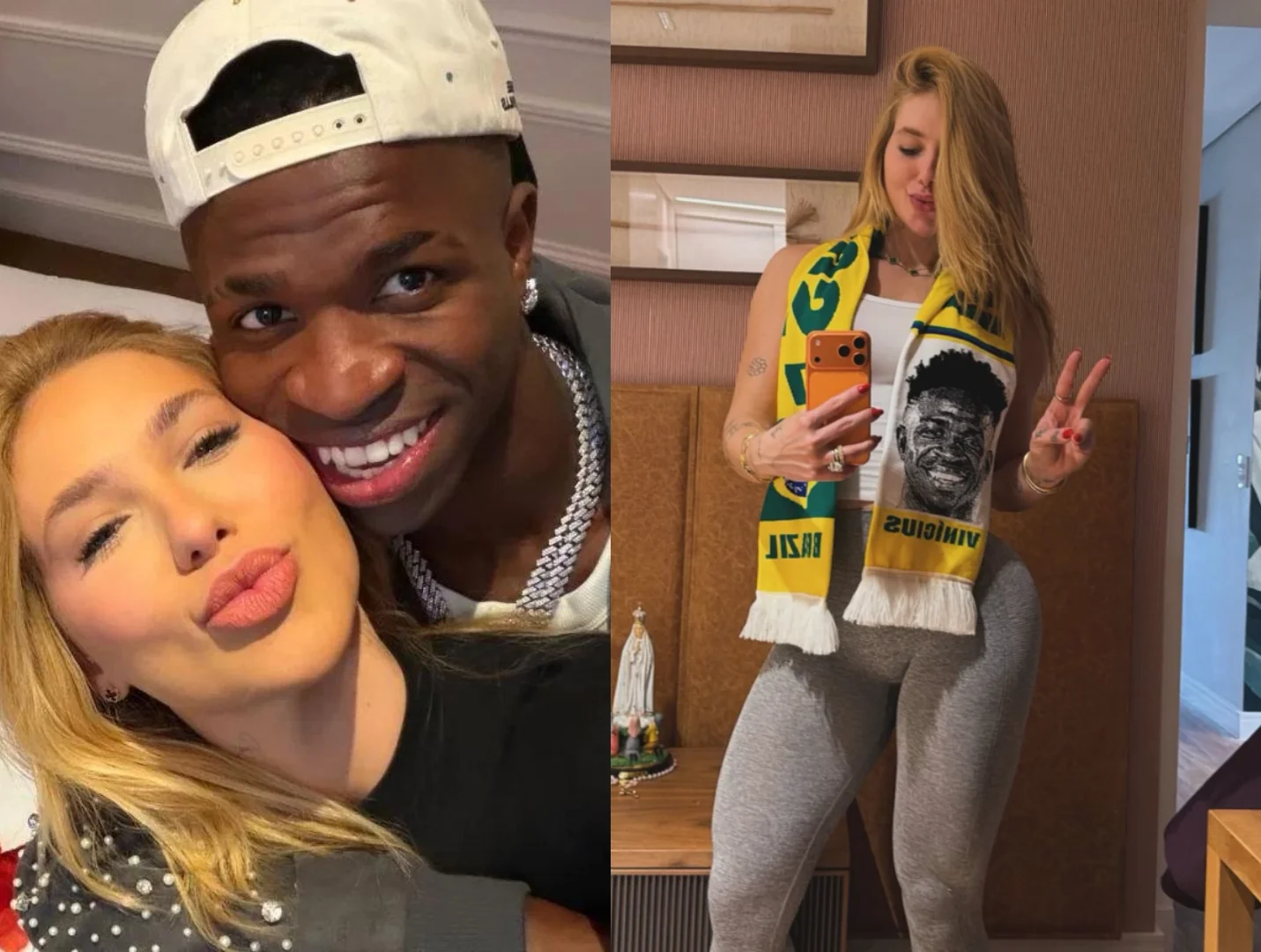 A apresentadora mostrou o mimo nos stories do Instagram e brincou sobre o gesto do namorado. “Deixar bem registrado aqui que essa faixa do Brasil com a cara do Vini quem me deu foi ele. Ele reclama, mas no fim ele gosta. Ele que me deu, reclamou do Real Madrid… Mas ele que me deu. Não pode reclamar. Agora tenho do Brasil e do Real”, disse, em tom de bom humor.