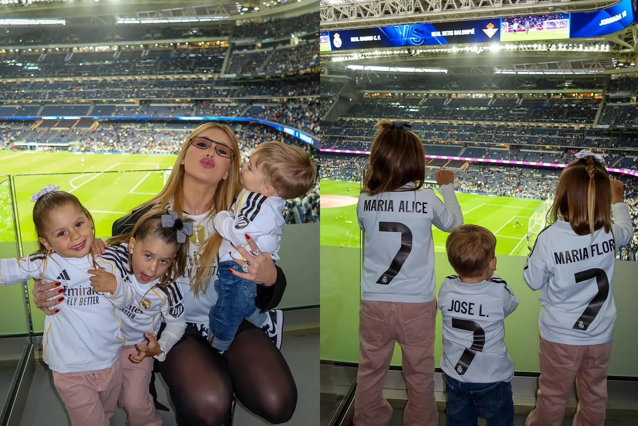 Virginia Fonseca levou os filhos que teve com o ex-marido, Zé Felipe, ao estádio Santiago Bernabéu, em Madri, para assistir a uma partida de futebol do atual namorado, Vini Jr, jogador do Real Madrid. A influenciadora compartilhou registros da experiência nesta segunda-feira (05), mostrando Maria Alice, de quatro anos, Maria Flor, de dois, e José Leonardo, de apenas um, durante o jogo.