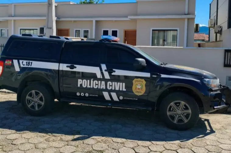 Viatura da Polícia Civil de SC em frente ao edifício no bairro Meia Praia, em Navegantes, onde um casal de idosos foi vítima de latrocínio. (Foto: Instagram)